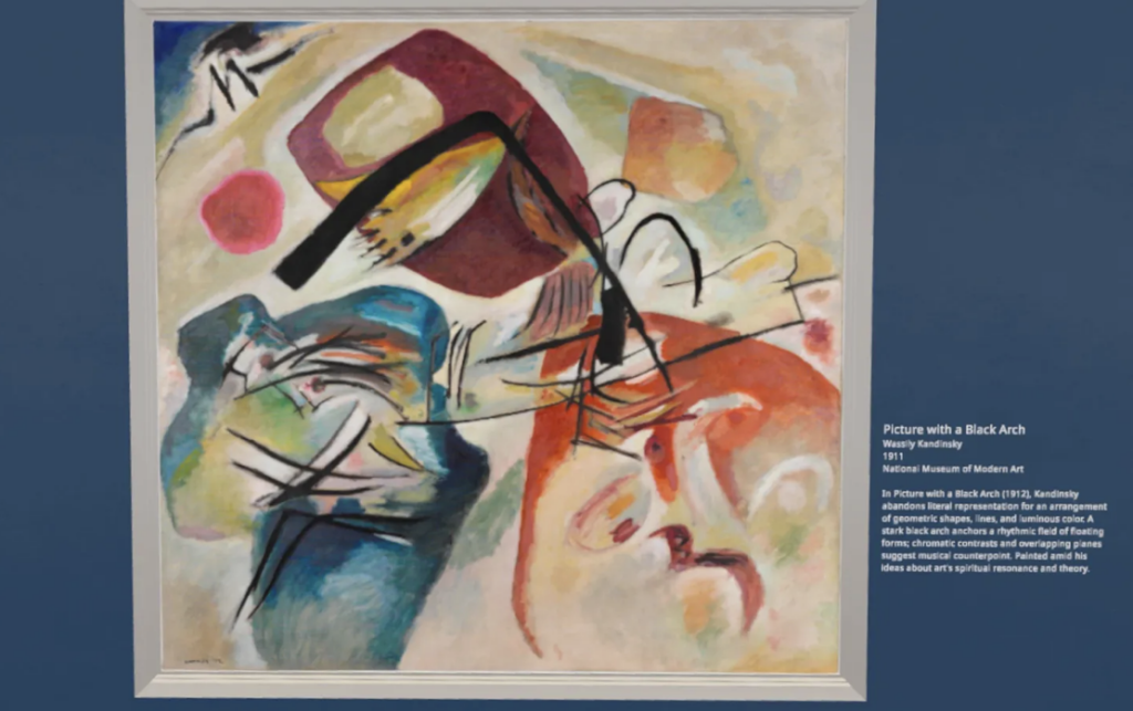 Самый яркий опыт в ArtQuest VR может испытать с работой Василия Кандинского «Картина с черной аркой». Используя опцию «смещения высоты», подняться по невидимой лестнице и зависнуть перед холстом. Внезапно увидеть не просто абстрактные формы, а следы дирижерской палочки. Густые мазки — это форте, мощный аккорд. Легкие штрихи — пианиссимо. Короткие, резкие линии — стаккато. Стоя в виртуальной пустоте, можно повторить движения кисти Кандинского, Кандинский часто сравнивал живопись с музыкой. В обычном музее вы бы прочитали эту информацию на табличке. В VR ее можно почувствовать. Это и есть квантовый скачок в восприятии.